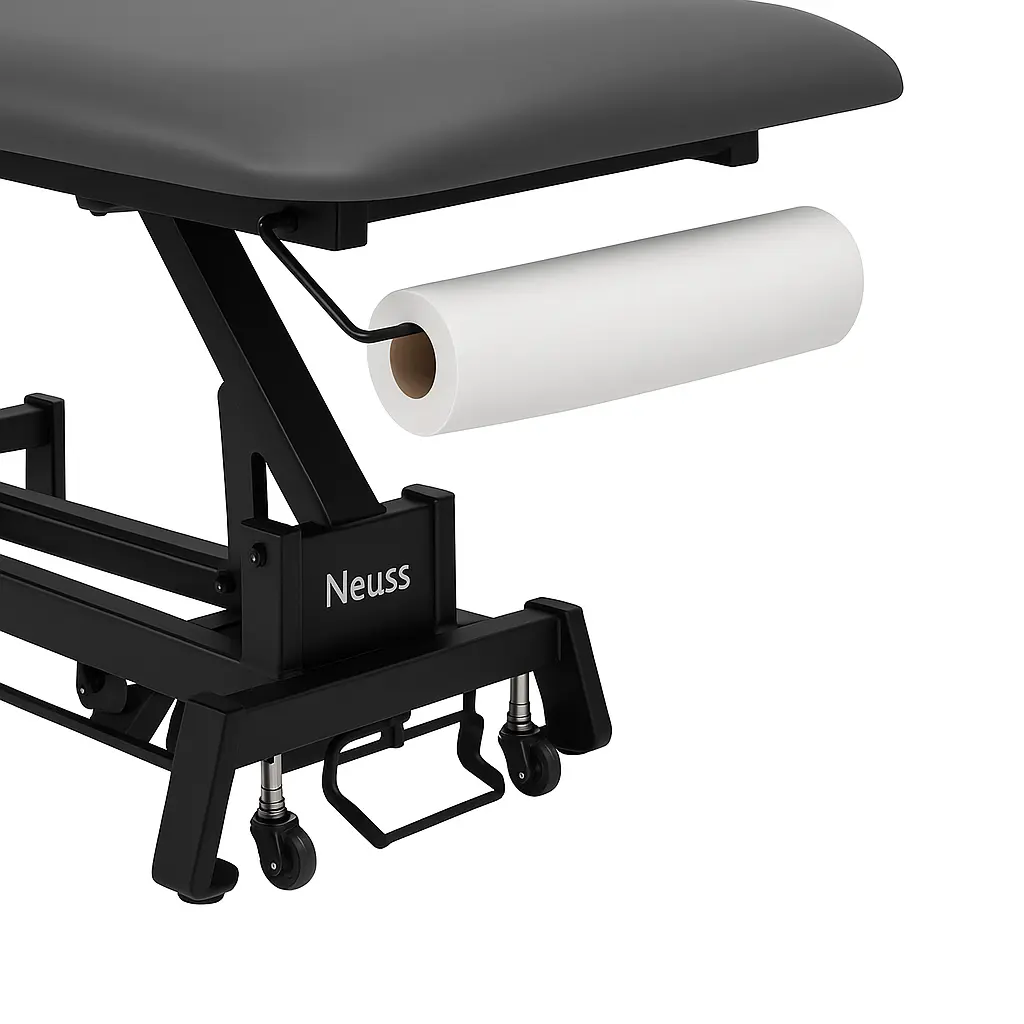 Le porte-rouleau intégré facilite l’installation du drap d’examen et assure un déroulement rapide et propre entre chaque patient. L’ensemble témoigne d’une conception orientée vers l’efficacité et la praticité, parfaitement adaptée aux exigences du milieu professionnel.