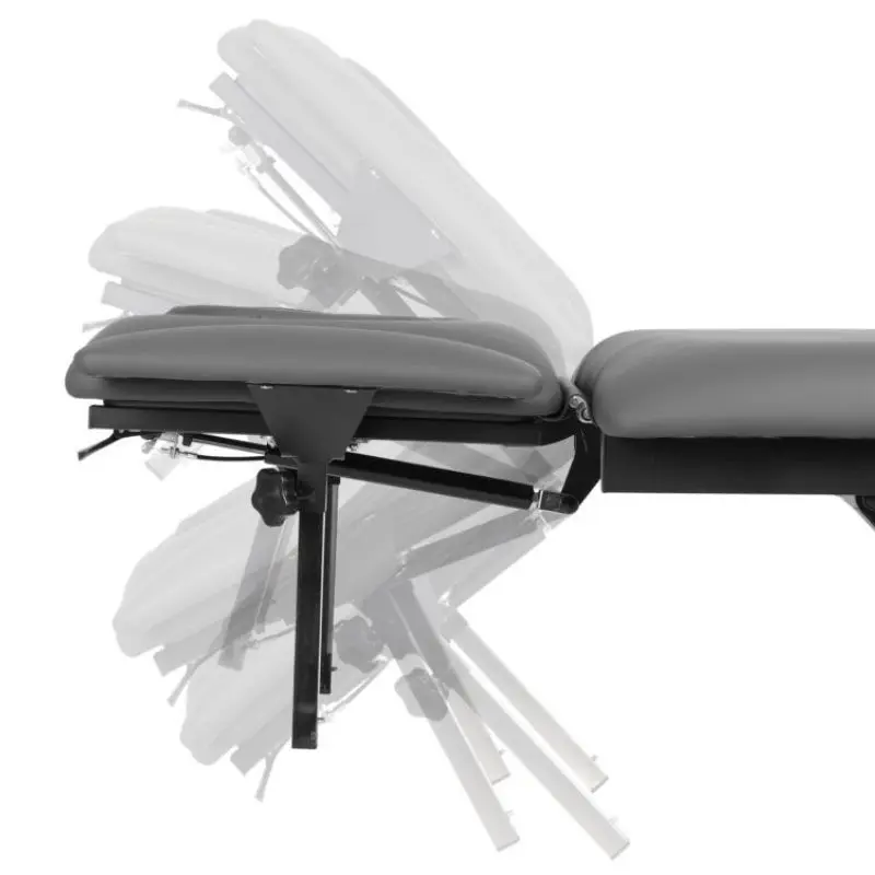 Table de soin se distingue par un mécanisme d’inclinaison parfaitement maîtrisé, offrant une polyvalence exceptionnelle pour s’adapter à chaque pratique professionnelle. La section centrale, présentée ici à travers plusieurs positions superposées, met en évidence une cinématique fluide et précise, idéale pour les soins nécessitant un ajustement millimétré de l’angle de travail.