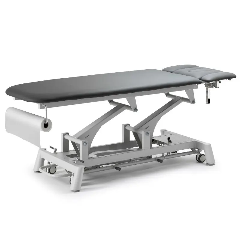 Présentée en position plate, cette table offre une large surface de travail parfaitement stable, idéale pour les soins de kinésithérapie, de massage ou d’évaluation posturale.